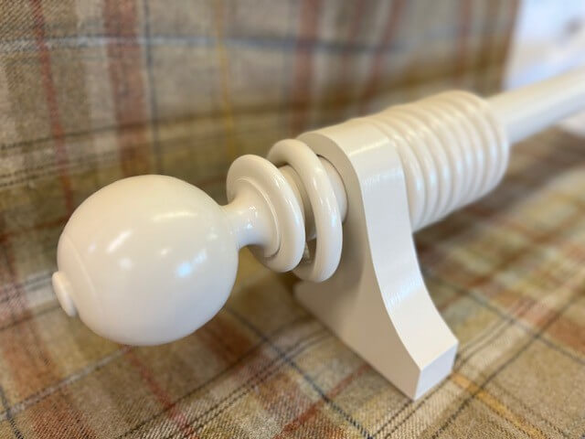 It consists of a 50mm diameter plain pole at 1935mm length together with two Ball finials, two Plain Cup brackets, and 18 rings, and all finished in F&B Joa’s White with a satin varnish.