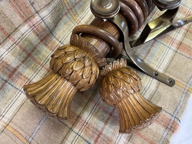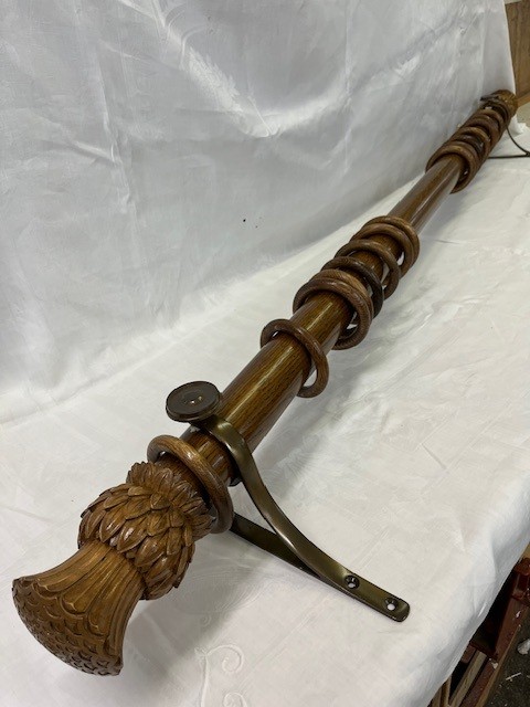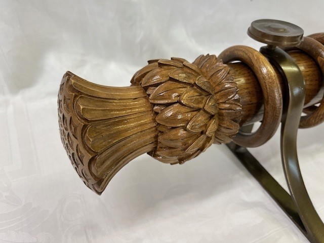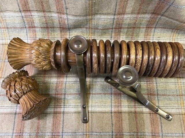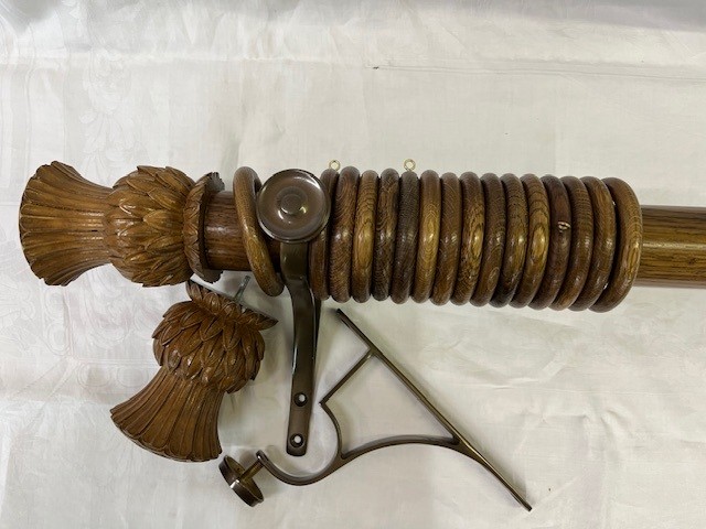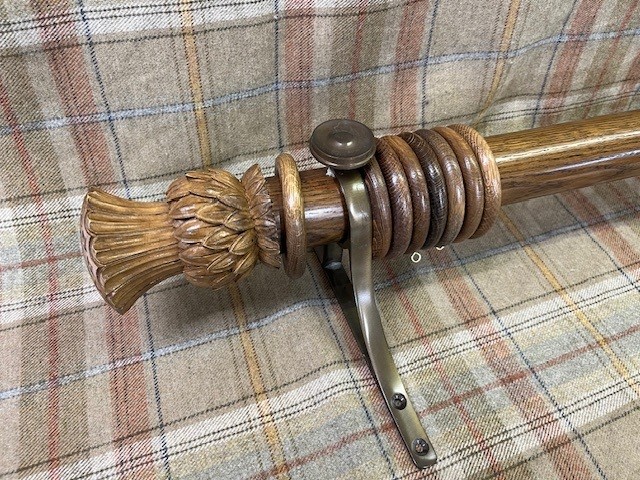 This 63mm diameter light oak stained pole is matched with two of our Whisky design finials and 16 oak rings.
