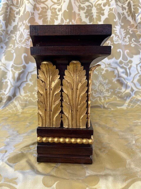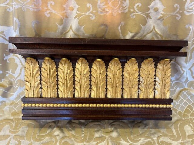 The Acanthus Leaf and Bead pelmet, in this colour combination of solid Mahogany and Dutch metal leaf gilding, has been a very popular design over the years.