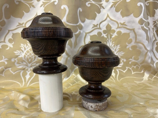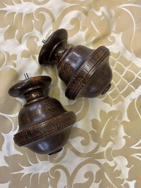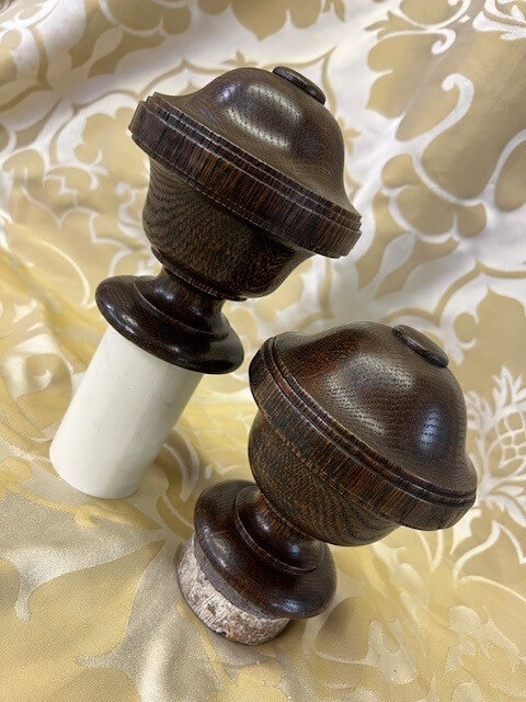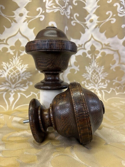 A pair of uncarved Waterleaf oak finials with a dark tone finish.