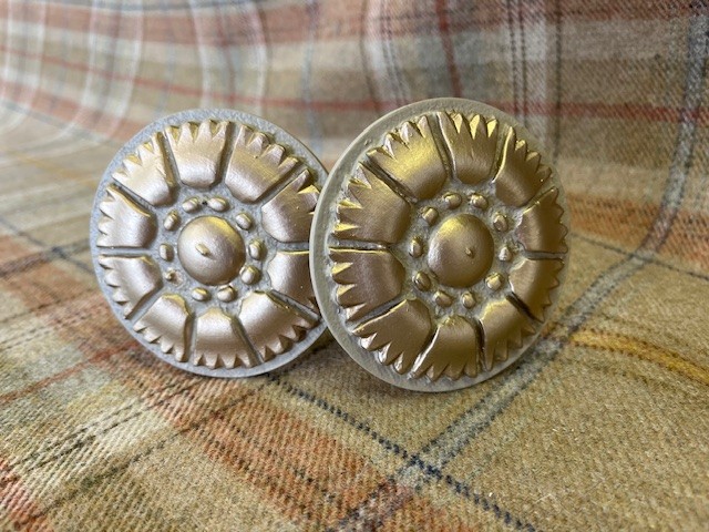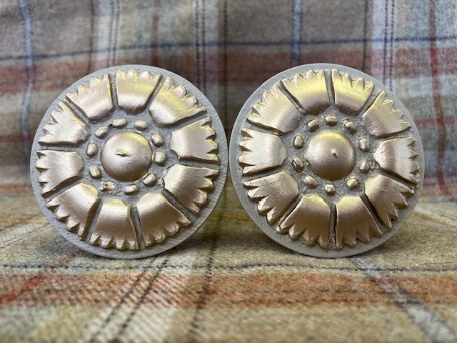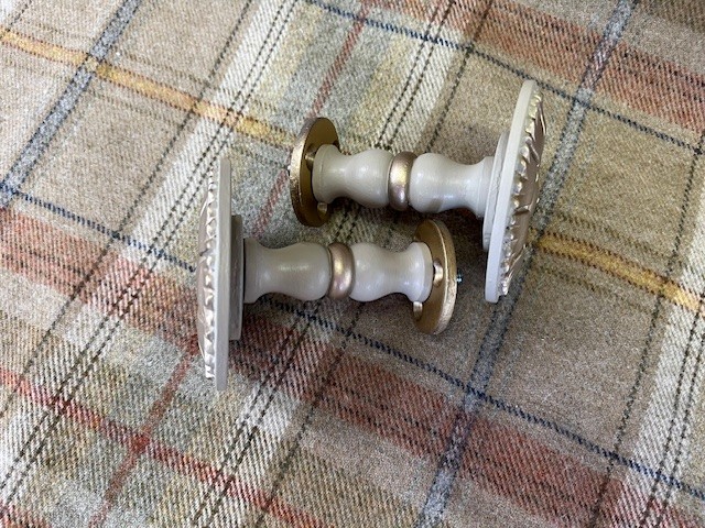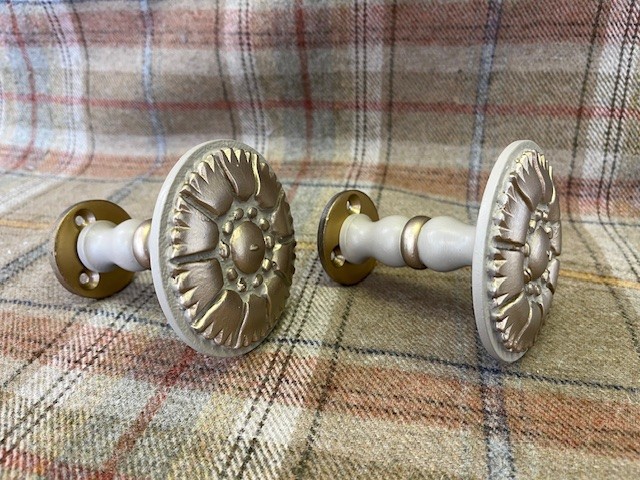 This pair of tiebacks was a prototype for a more delicate style, similar to cornflower, F&B Light Gray and Trianon Gilt