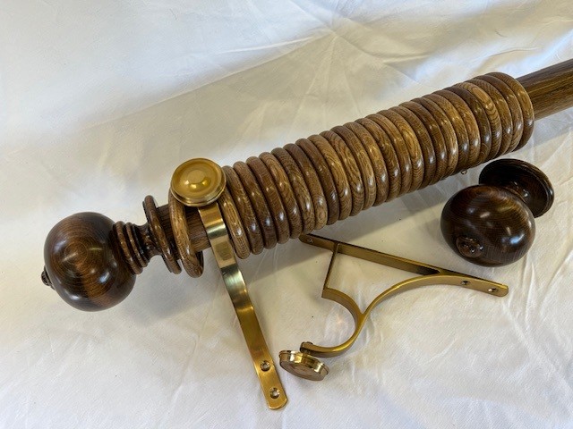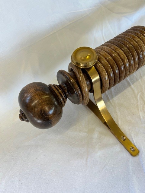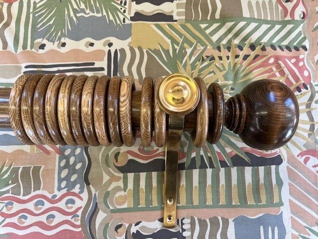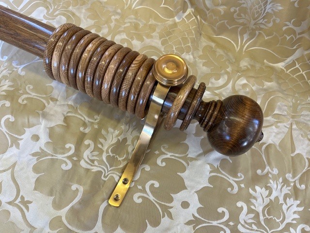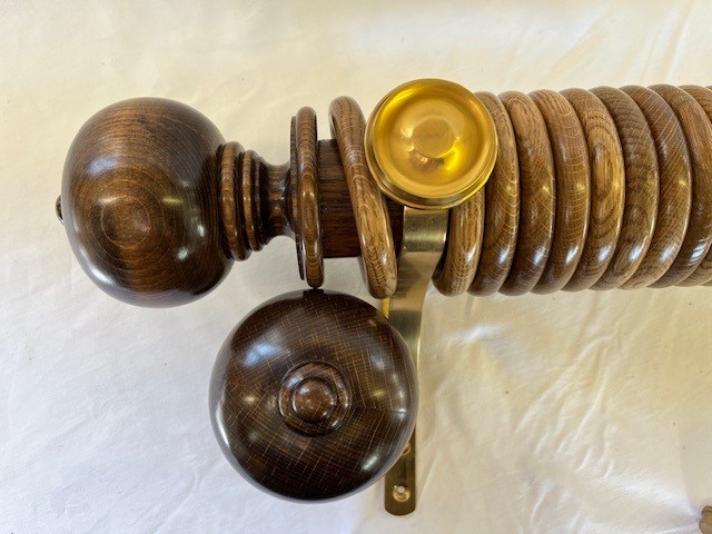 Gorgeous mid oak polished finish, this 60mm dia. pole has 26 rings, a pair of matching Simple Ball and Button finials plus a pair of polished and lacquered brass end brackets.