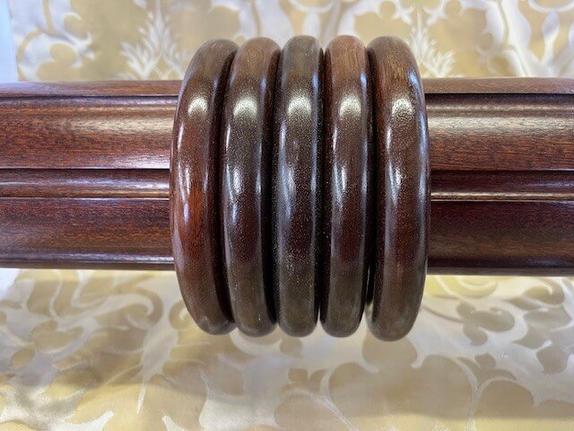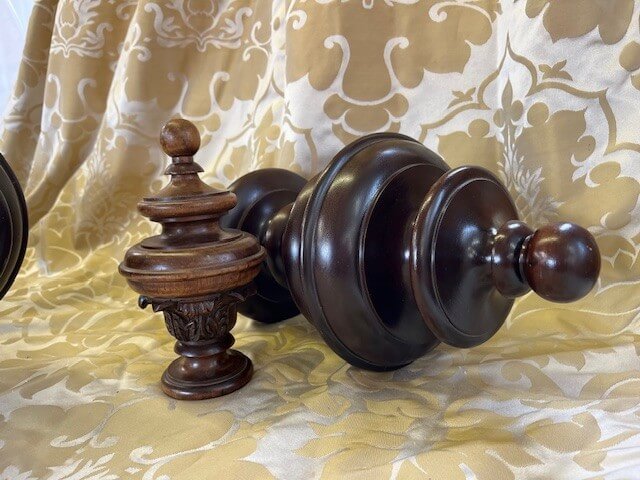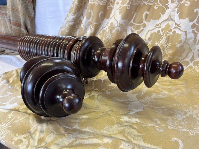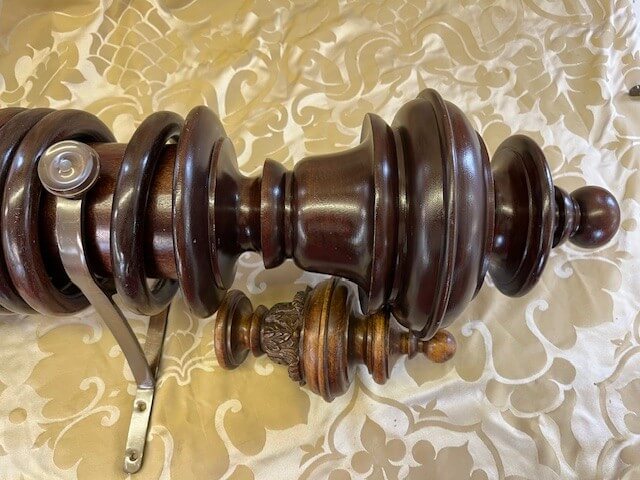 Very Large mahogany pole set with finials, rings and overclip brackets